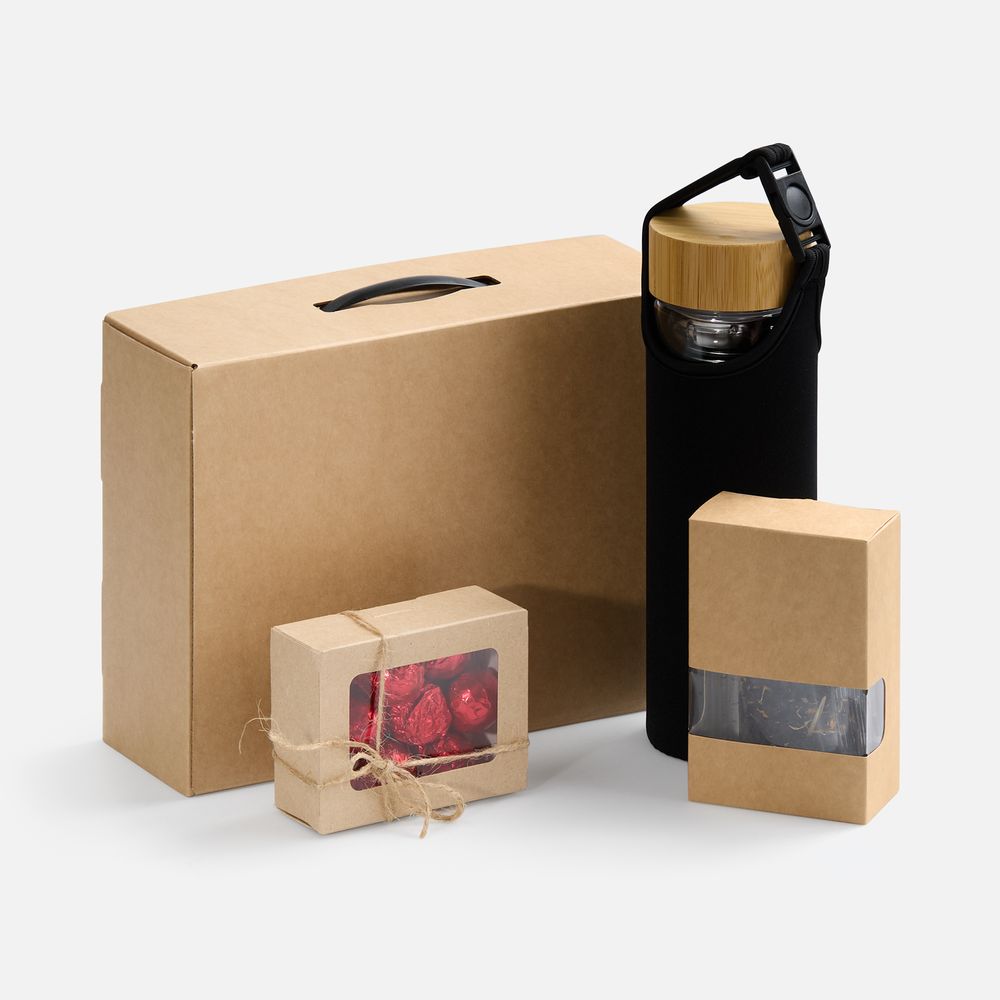 - бутылка - боросиликатное стекло, нержавеющая сталь, бамбук, неопрен; коробка - картон, пластик