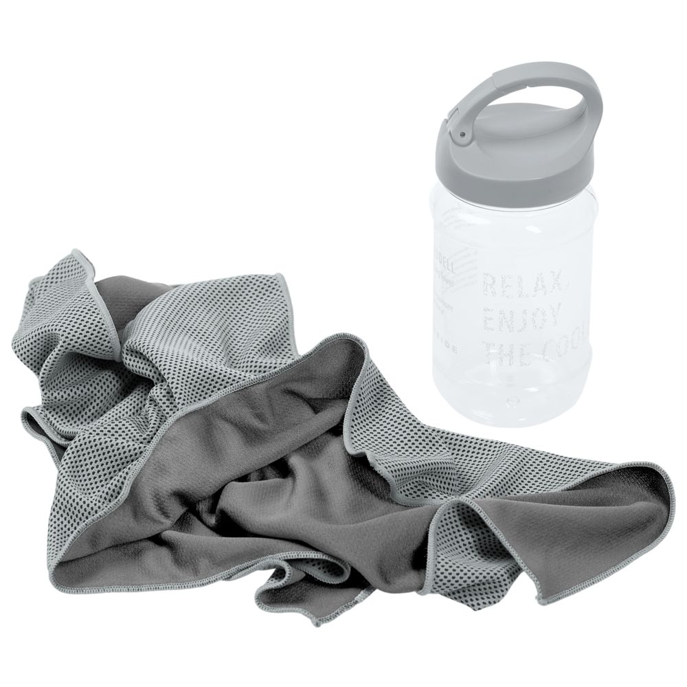 - бутылка - пластик; полотенце - полиэстер, 45%, нейлон 55%, плотность 160 г/м²