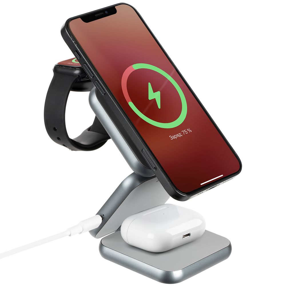 Terza — компактное устройство для беспроводной зарядки сразу трех устройств. Станция легко складывается в стильный миниатюрный куб, поэтому ее удобно использовать и в офисе, и в дороге, Продуманная конструкция позволяет фиксировать пластины в любом положении, в том числе свернуть их в удобную подставку для телефона.Смартфоны в металлических корпусах удерживаются на площадке за счет встроенного в станцию магнита. Прочие смартфоны необходимо дополнить металлическим стикером для надежного удержания на зарядной области. Плотный защитный чехол может мешать удержанию смартфона на станции.Зарядная станция совместима со всеми смартфонами, поддерживающими технологию беспроводной зарядки Qi. Также предусмотрено место для зарядки часов Apple Watch и наушников. Зарядка начнется автоматически при размещении устройств на индукционной площадке.  Беспроводная зарядка стандарта QiЗоны беспроводной зарядки для смартфона, наушников и часовВход: 5 В, 2 A; 9 В,1,67 A; 12 В, 1,5 AВыход беспроводной зарядки: - смартфон: 15 Вт- наушники: 5 Вт- часы: 2,5 ВтКорпус с металлической отделкойРаботает при питании от сетиВ комплекте кабель USB Type-C, адаптер питания приобретается отдельно.Поставляется в индивидуальной упаковке.Внимание! Не все модели смартфонов, часов и наушников поддерживают функцию беспроводной зарядки.